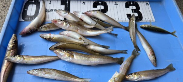 シロギス(堤防) 2025年10月16日(木曜日)堤防投げ釣り宮川丸 釣 果 : 22匹 大きさ : 10〜17cm 場 所 : 各堤防 コメント アタリポツポツ有りましたが、雨降りだしてからアタリなくなって数のびませんでした。 ルアーは単発で釣れてたかんじです。 クロダイは41~45㎝ 0~2枚でした。 Facebook で共有するにはクリックしてください (新しいウィンドウで開きます) Facebook クリックして Line で共有 (新しいウィンドウで開きます) Line クリックして X で共有 (新しいウィンドウで開きます) X いいね:いいね 読み込み中…